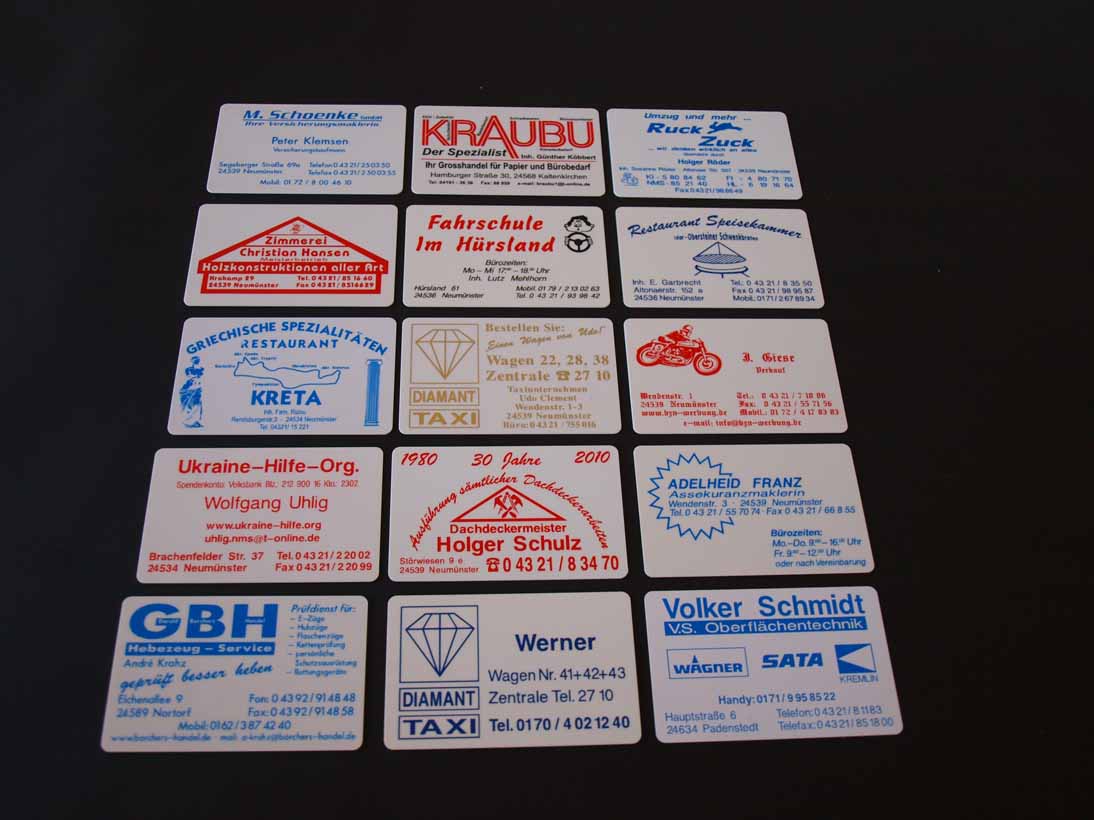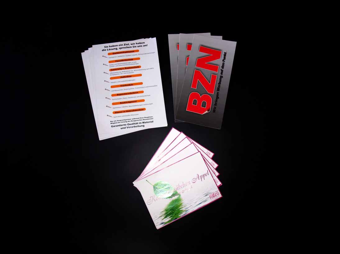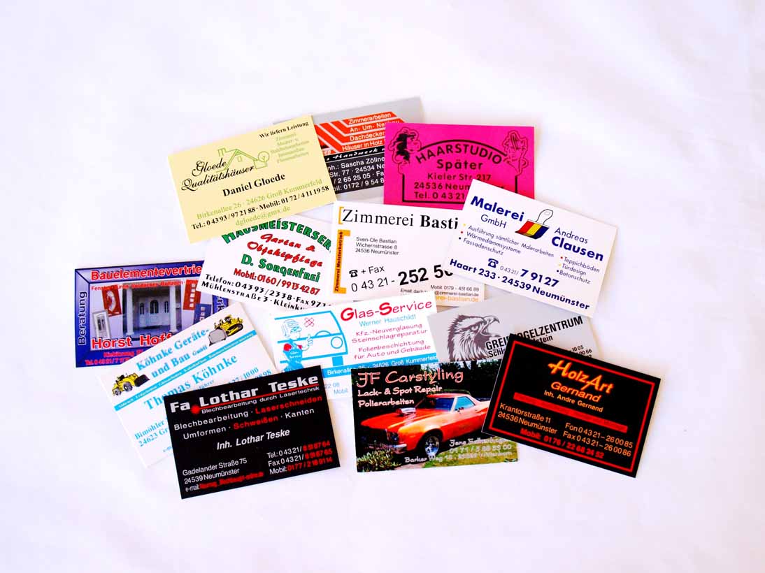 Im Bereich der Geschäftsausstattung gestalten wir für Sie diverse Produkte und stellen diese her. Unser Repertoire umfasst Stempel, Visitenkarten, PVC Karten, Flyer und Briefbögen.